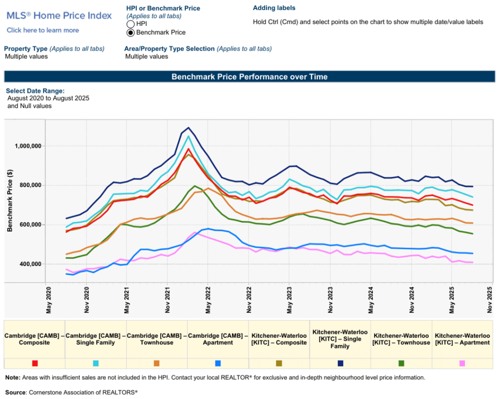 In August, the average sale price for all residential properties in Waterloo Region was $728,465. This represents a 5.5 per cent decrease compared to August 2024 and a 1.0 per cent decrease compared to July 2025.