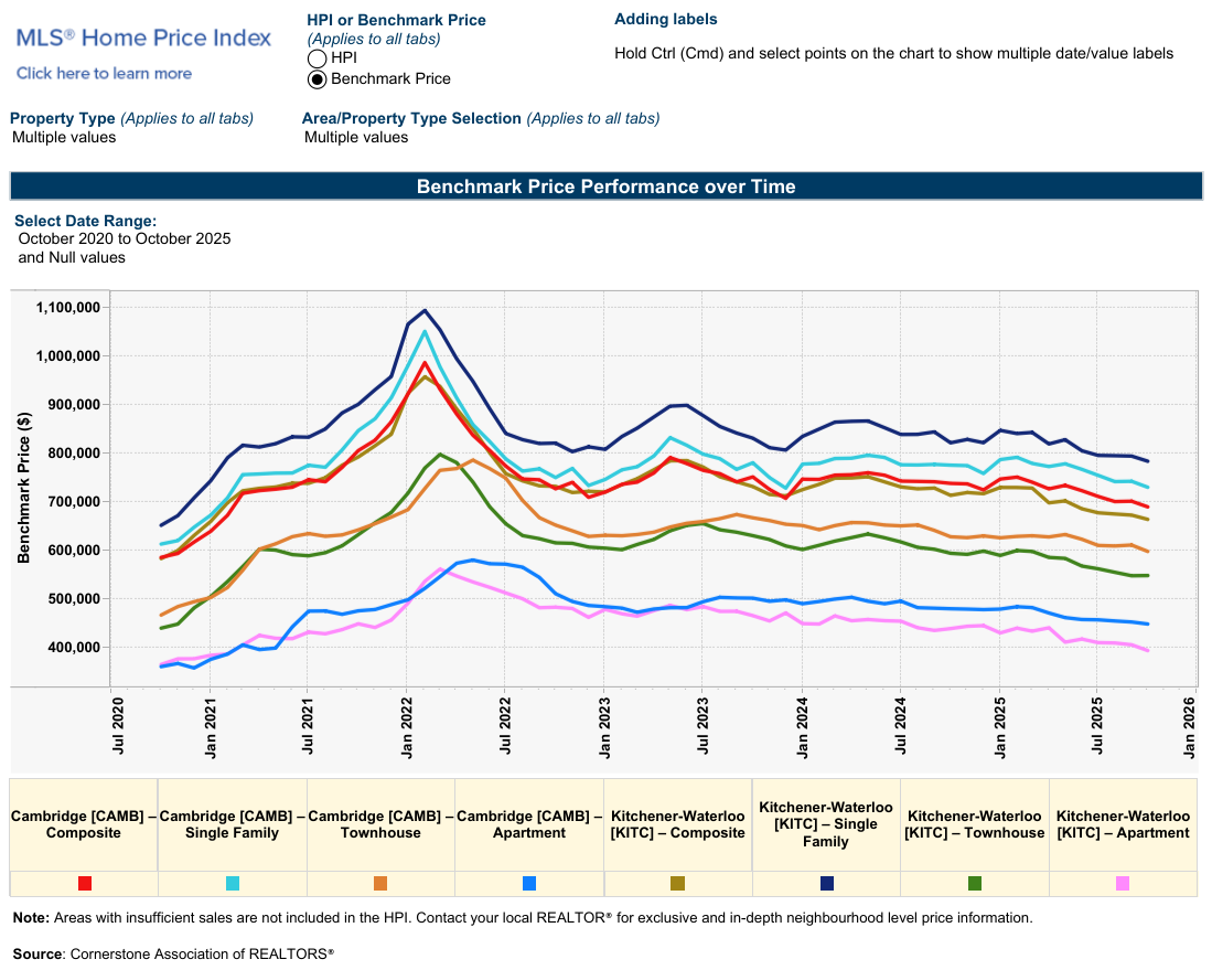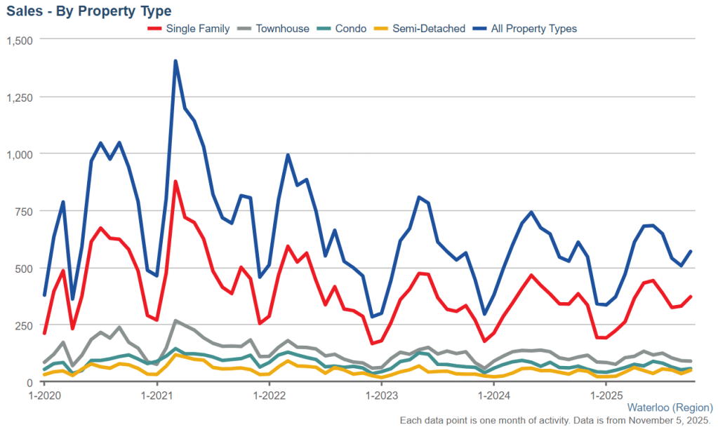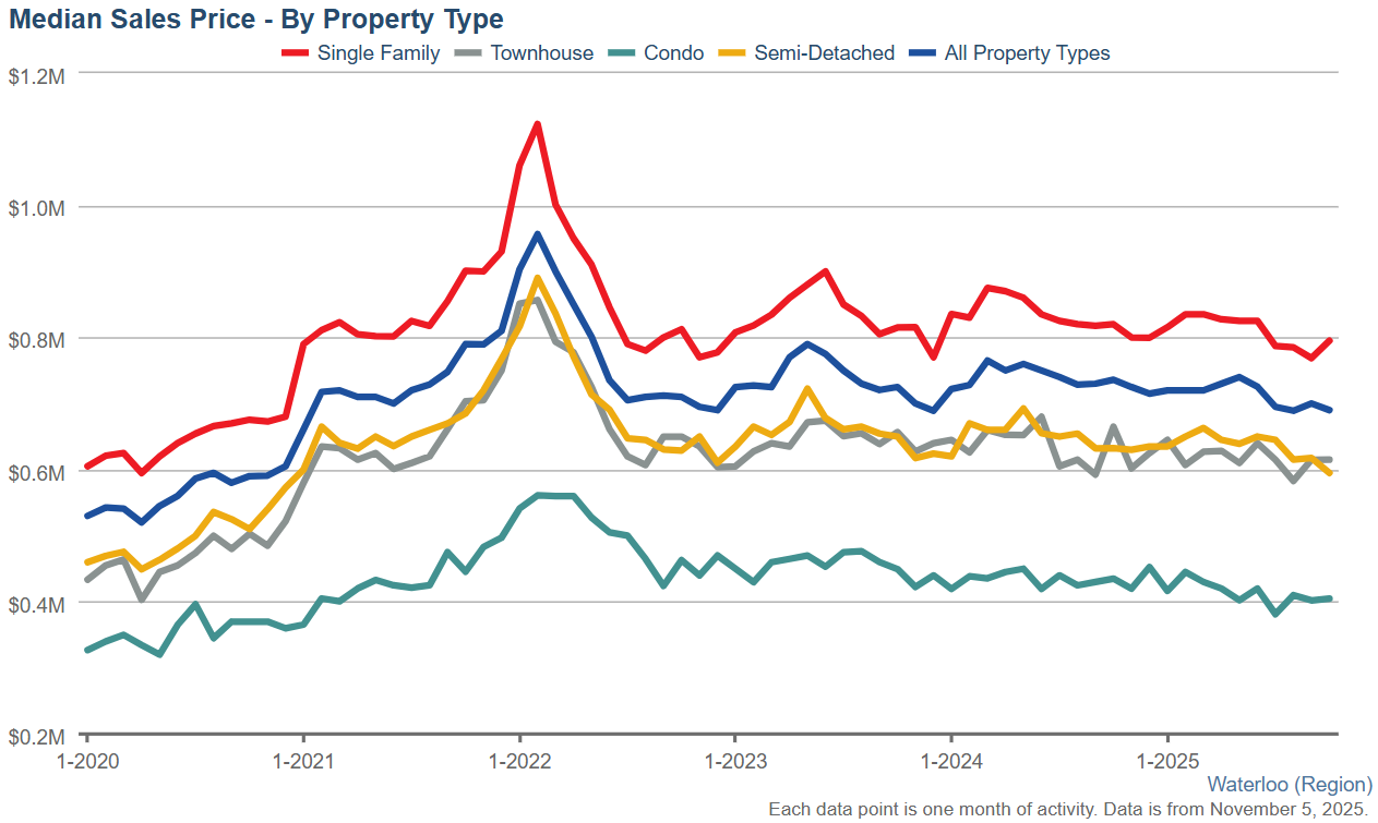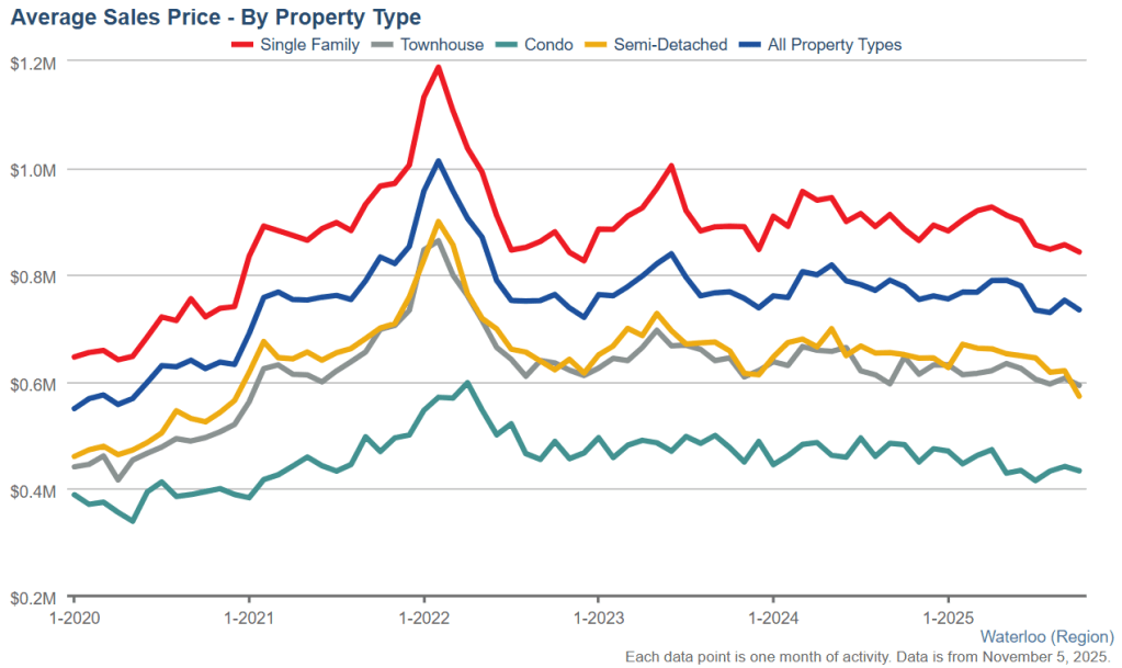 In October, the average sale price for all residential properties in Waterloo Region was $734,928. This represents a 5.6 per cent decrease compared to October 2024 and a 2.4 per cent decrease compared to September 2025.